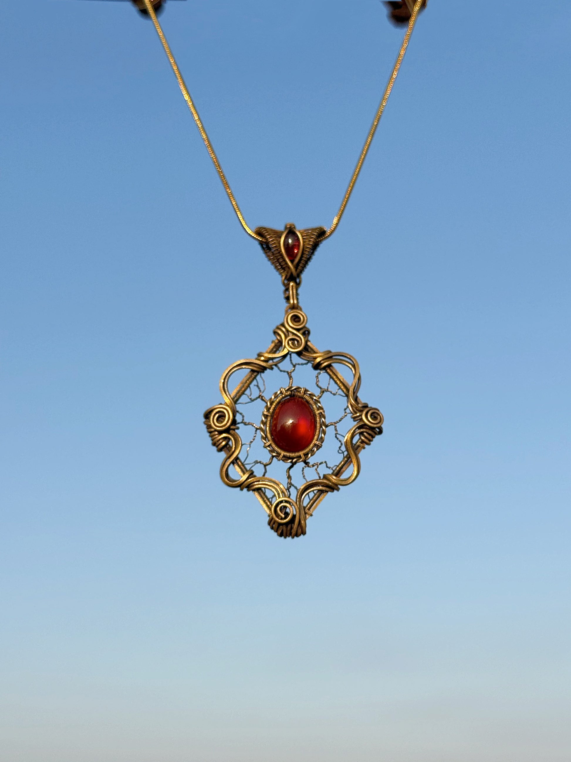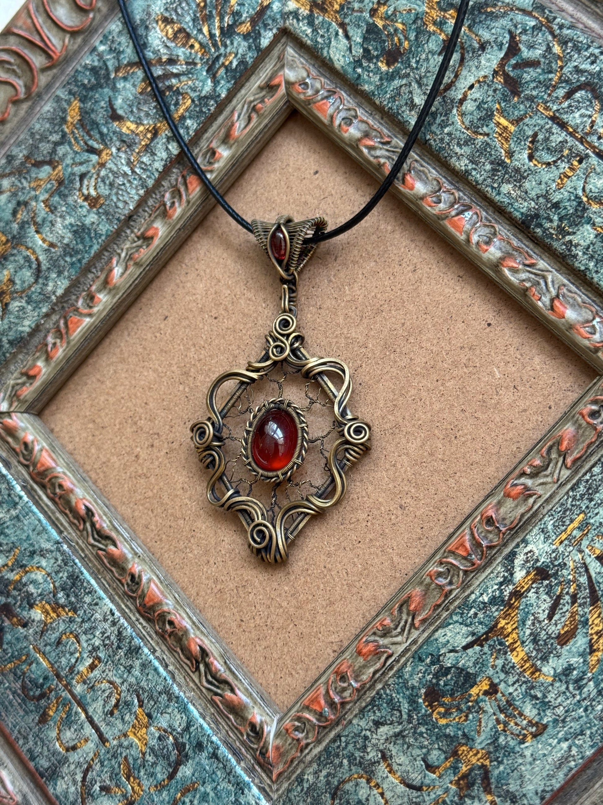 There is a quiet, haunting beauty in the way deep red and weathered bronze come together. For this piece, I’ve cradled a wine-dark garnet within layers of antiqued bronze wire, using intricate scrollwork and a hand-oxidized finish to evoke the feeling of a vintage gate in a forgotten garden. It’s one of those designs that feels like it has already lived a thousand years before being found.